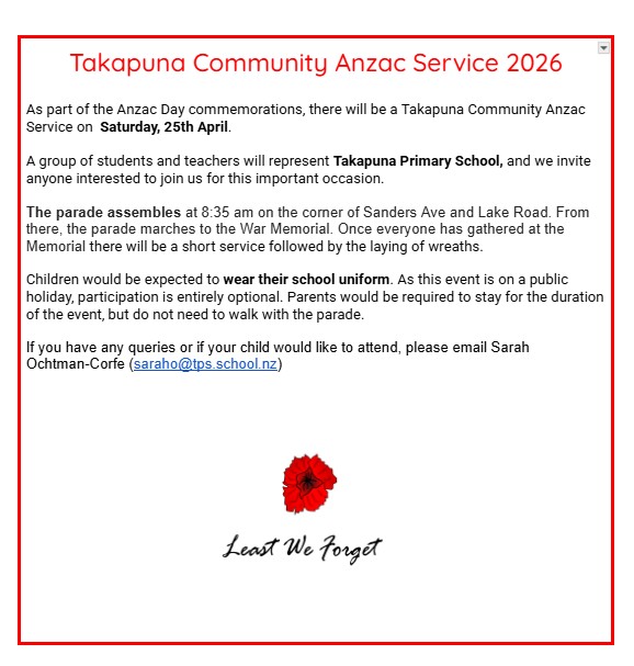 Rippa Rugby TournamentNorth Harbour Rugby are hosting their Annual Primary School Rippa Rugby festival for 2026 and this is a two day tournament on Thursday 21st May and Thursday 27th August. The aim is to encourage children to get active and give rippa rugby a go! If your child is in Year 3-6 and keen to have a go, you can register here . Registrations close on Wednesday 25th April.